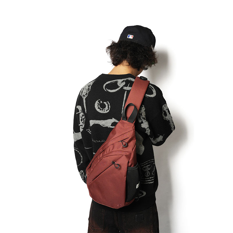 2箇所のファスナー付きポケットとサイドに配置したメッシュポケットであらゆる荷物を収納できるワンショルダーのTRIANGLEバックになります。